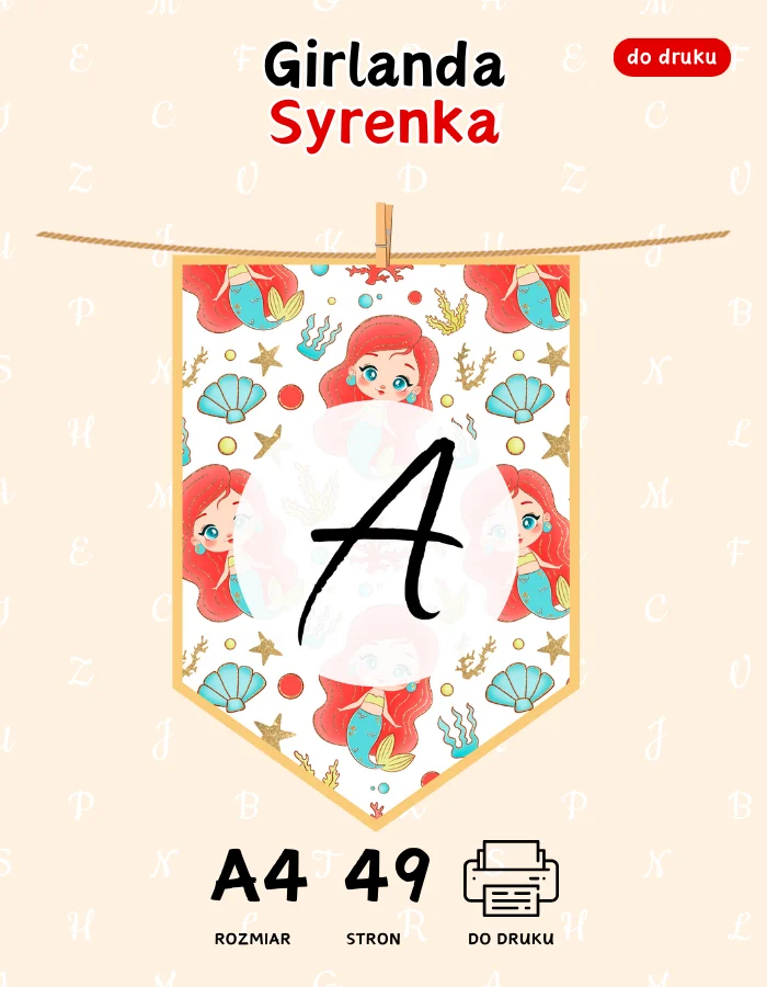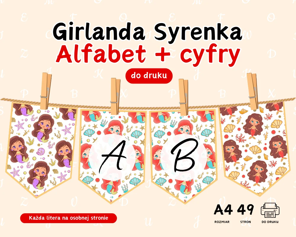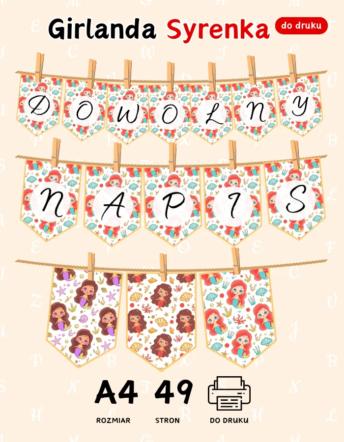 Girlanda syrenka – cały alfabet wraz z cyframi w formie girlandy do samodzielnego wydruku