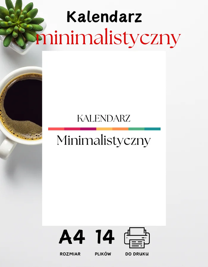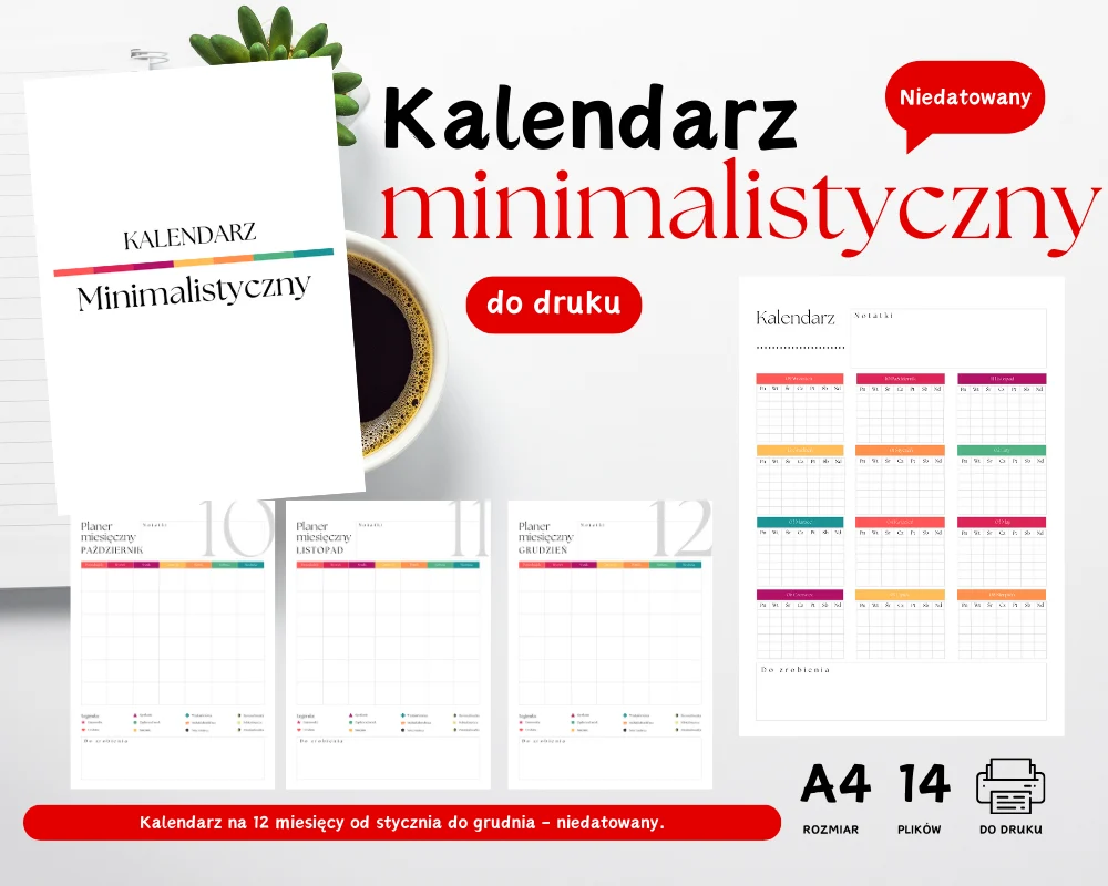 Kalendarz niedatowany minimalistyczny składa się z 14 stron A4 PDF do druku, a w tym: