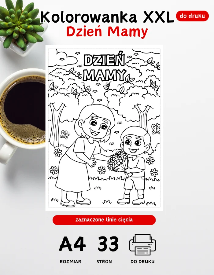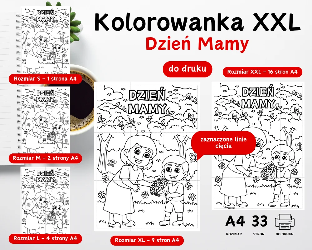 Kolorowanka XXL Dzień Mamy (25.05) – składa się z 33 stron A4 do druku w 5 rozmiarach do wyboru. Plik w formie cyfrowej PDF do pobrania na swój komputer.