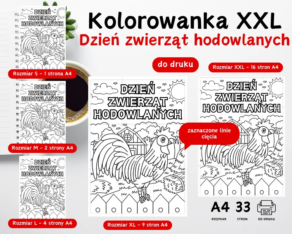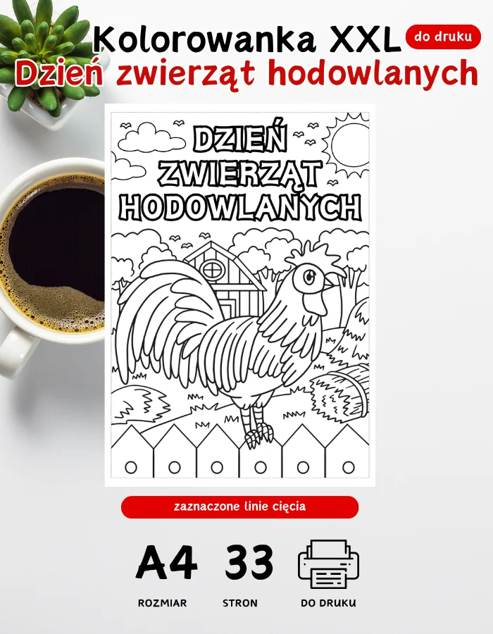 Kolorowanka XXL Światowy Dzień zwierząt hodowlanych – składa się z 33 stron A4 do druku w 5 rozmiarach do wyboru. Plik w formie cyfrowej PDF do pobrania na swój komputer.