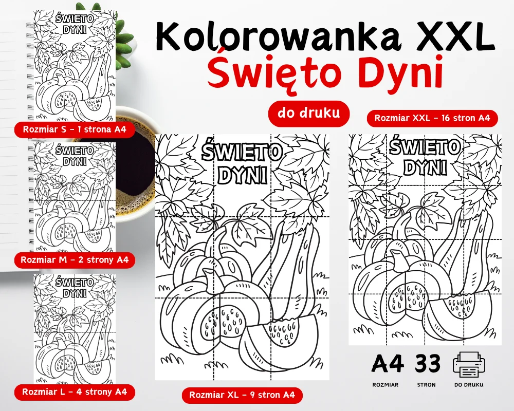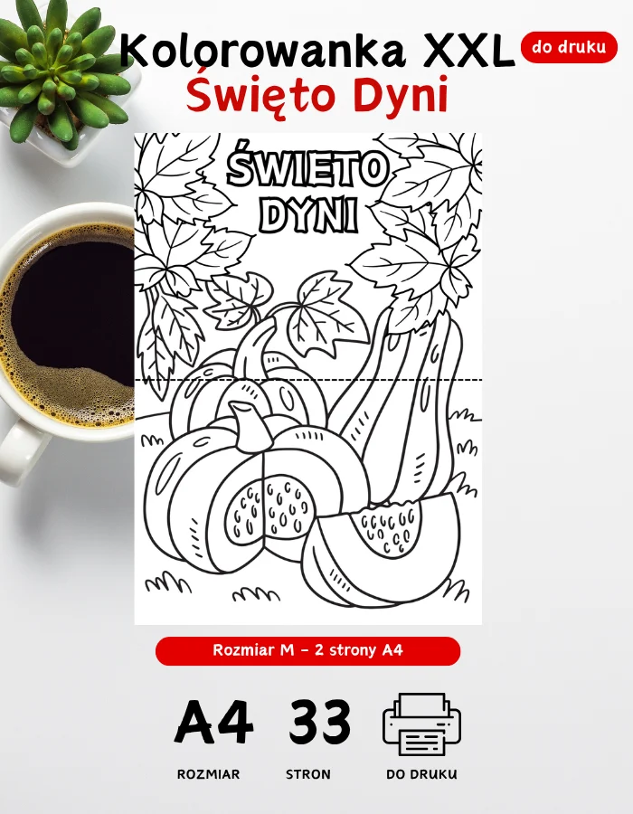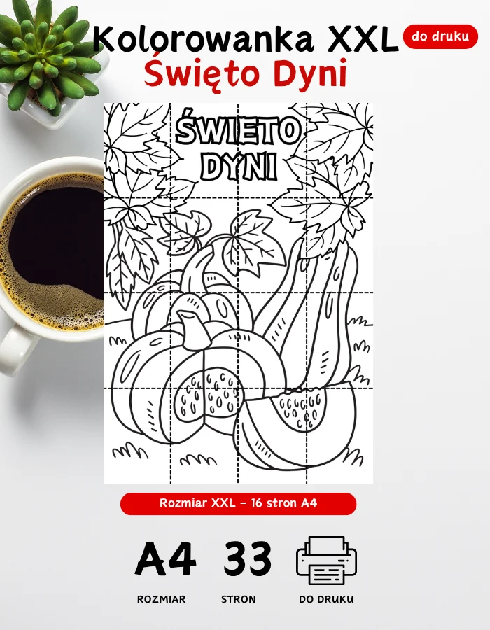 Kolorowanka XXL Święto dyni – składa się z 33 stron A4 do druku w 5 rozmiarach do wyboru. Plik w formie cyfrowej PDF do pobrania na swój komputer.
