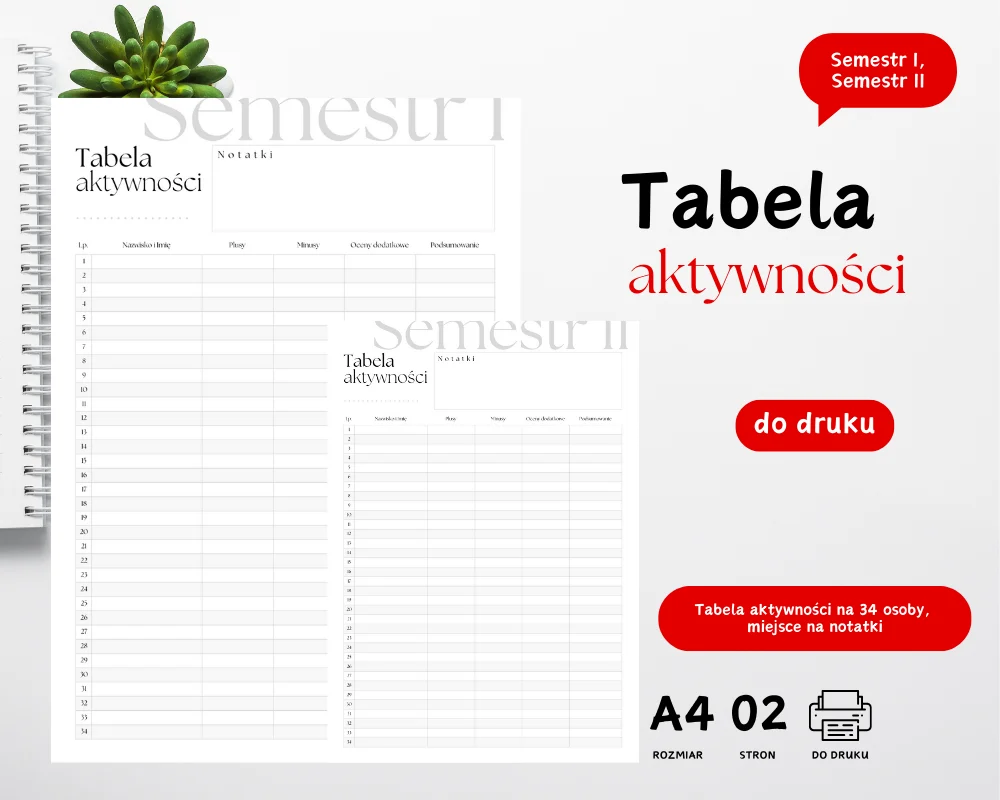 Tabela aktywności do druku w formie pliku PDF, 2 strony: